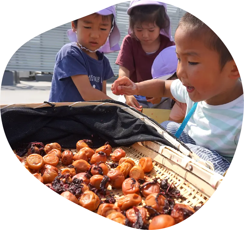 食べることは、「人」が「良」くなること。素材、調味料にこだわり暮らしています。給食は自然農や農薬の少ない旬の食材、添加物の入っていない調味料で手作りしています。また、年長組はうめぼしや味噌作りに取り組み、日本伝統の食文化を大切にしています。